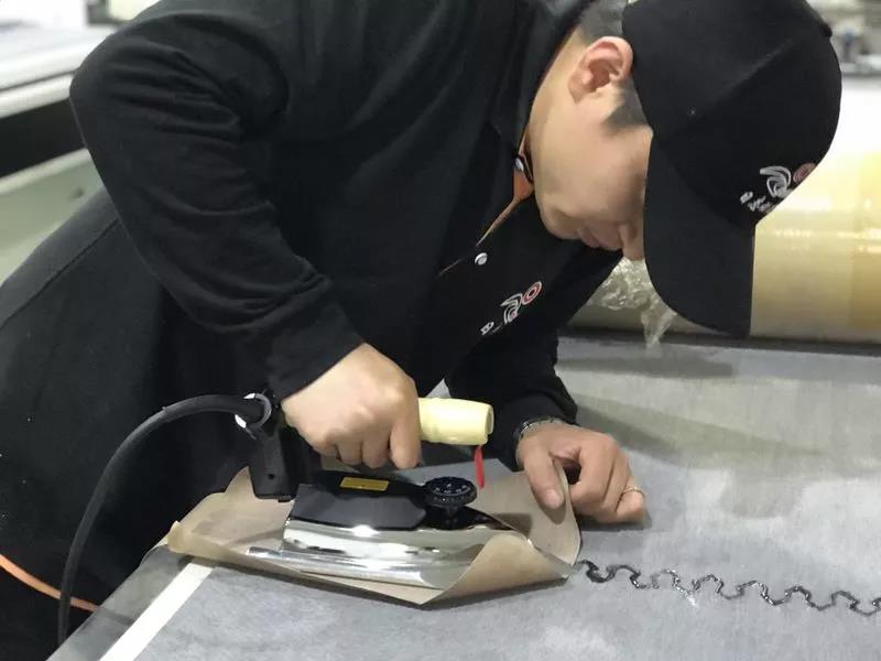 在接頭下方墊上我們提供的超長特氟龍布,并且將工業(yè)熨斗調(diào)至80度進行預(yù)熱,預(yù)熱完成后在熨斗下墊上長方型特氟龍布在齒上進行來回熨燙。